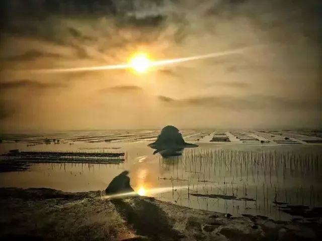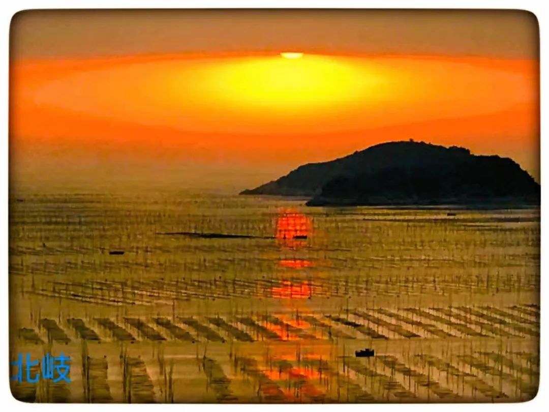 04:30 起床后前往【北岐】日出《中国邮票取景点》,北岐村是紫菜养殖场,满滩满海散落着紫菜架和船只。涨潮时海上忙碌的船只穿梭在浮标竿影(紫菜架)之间,与大海、远山、岛屿浑然一体。退潮时海滩的纹理渐显秀质,劳作的渔民游动在虎皮滩上,使得这片滩涂更具韵律美和动态美。此刻无论从哪个角度观赏拍摄,取景框里都无法抗拒那些由光影变幻组合而成的五彩滩涂的诱惑力。每当北岐紫菜生产的繁忙季节,滩涂上万根竹竿插成一块块方形的网框,由远及近,绵延数十里,蔚为大观。清晨六点左右,一轮火球从海面上喷薄而出,瞬间,大海像镀上了一层金色霞衣,上百米的山道上,摄影师们屏住了呼吸,"咔嚓、咔嚓"声响成一片,紫菜在丝网上挂着一条条色带,红的,黑的,紫的,宛如一幅没有经过修饰的水墨画,被收入一个个镜头,被曝光在一张张彩色胶片上。